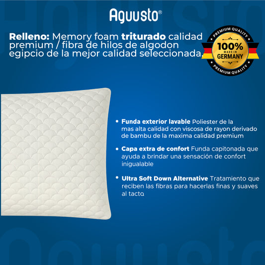 La almohada Aguusto está fabricada con espuma viscoelástica triturada (memory foam) de alta calidad. Este material se adapta ergonómicamente a la forma de tu cabeza y cuello, proporcionando un soporte personalizado y aliviando los puntos de presión durante el descanso.